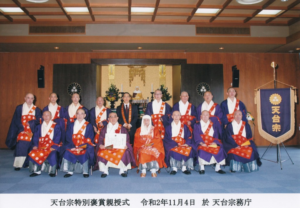 On 4th November 2020, Reverend Ichishima Shōshin, Kangaku, Dai-sōjō, Professor Emeritus at Taishō University and 36th Abbot of Senzōji, received the Tendai Tokubetsu Kōrōshō award in recognition of his admirable efforts to disseminate the precious teachings of Tendai Buddhism to the West, especially through his translation of the Tendai Shido Gyōki and other seminal works of our tradition in English. He is the 8th person to have received this important recognition of service since 1997.